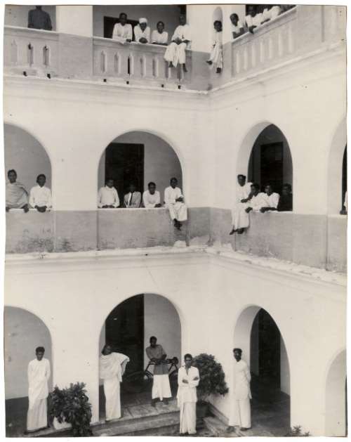 Uomini indiani affacciati al cortile di un palazzo