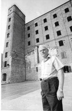 Mario Montanaro in cortile. Edificio centrale e piastra del forno sullo sfondo