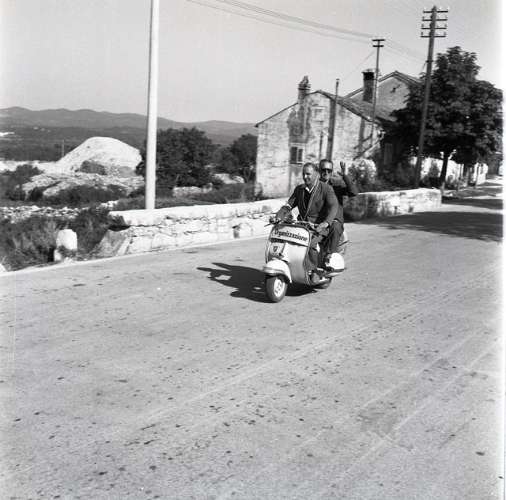Segnali limite velocità viale Miramare ; turisti francesi in vespa sulle rive