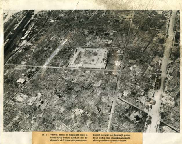 Veduta aerea di Nagasaki dopo il lancio della bomba atomica che distrusse la città quasi completamente