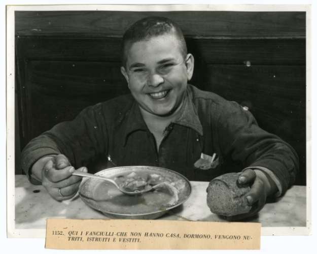 Bambino che mangia all'istituto figli del popolo a Napoli