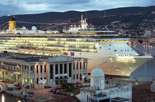 Stazione marittima, nave crociera, Costa Atlantica, rive di Trieste, notturni, pescheria, foto artistiche, turisti, piazza Unità notturni, rive di Trieste, regione, pullman. Acquirenti, shopping. Porto Vecchio, Adriaterminal.