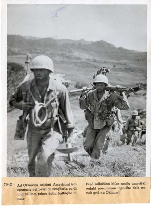 Ad Okinawa soldati Americani trasportano dei pezzi di artiglieria su di una collina, prima della battaglia finale