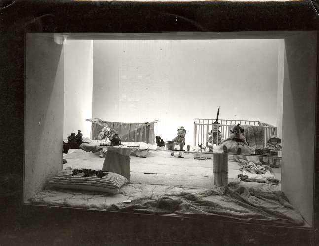Vetrine di Anita Pittoni contenente tende e tessuti da arredamento con giocattoli e oggetti per bambini