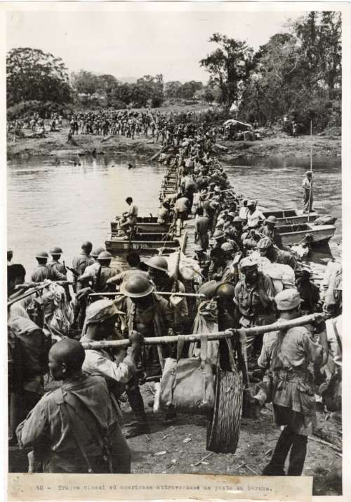 Truppe Americane e Cinesi su un ponte di barche improvvisato attraversano il fiume Mogaung