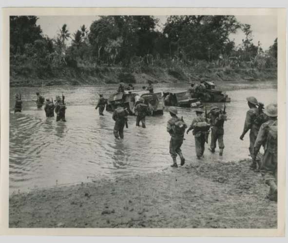 An R.A.F. Regiment patrol crossing a river in/ Central Burma, while seeking out Japanese cut off from their retreating armies