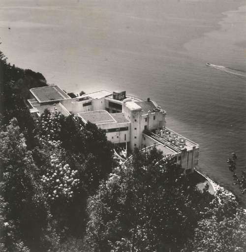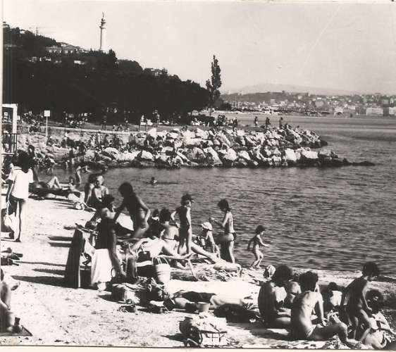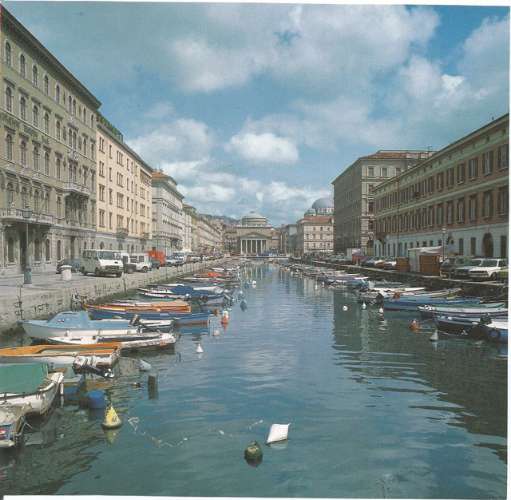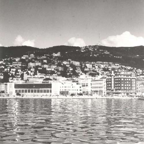 Molo Audace dal mare e palazzi sulle rive con altipiano sullo sfondo