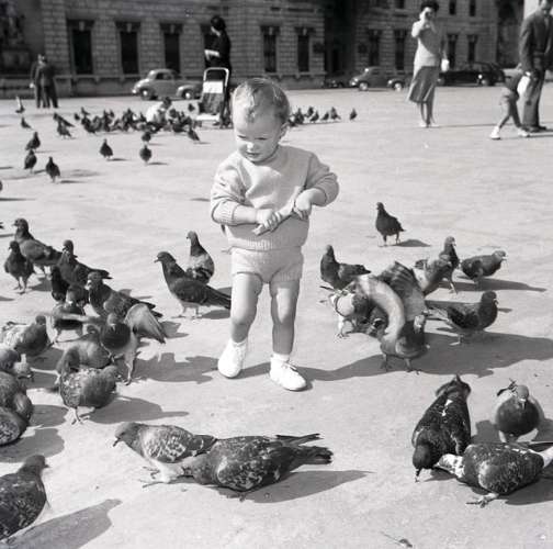 Bambino e colombi in piazza Unita' d'Italia