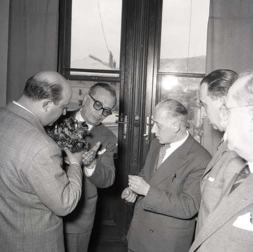 Associazione Artigiani: assessore Mauro premia pittore. Gruppo dirigenti all'esterno