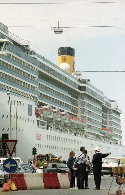 Stazione marittima, nave crociera, Costa Atlantica, rive di Trieste, notturni, pescheria, foto artistiche, turisti. Vigile urbano, traffico, Auta Marocchi, pullman, corriere, piazza Unità. ragazze, donne, triestine.
