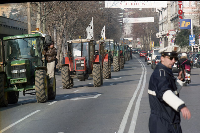 Protesta agricoltori '99, trattori, vigili, traffico bloccato, piazza Oberdan.