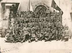 Gruppo di volontari triestini con Ferruccio Suppan che tiene la bandiera di Trieste