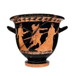 Cratere a campana attico a figure rosse; Lato A: giovane tra due fanciulle; Lato B: due giovani ammantati e figura femminile