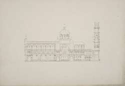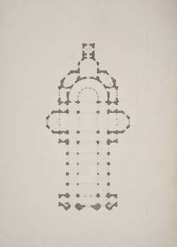 Progetto di chiesa in stile romanico con pianta a croce latina, con campanile posteriore