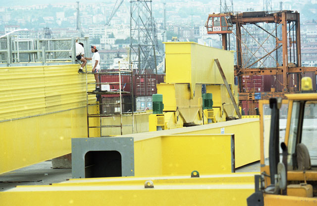Molo VII, gru posa in opera, operai, lavoro, ferrovia, treno, container, saldatore.
