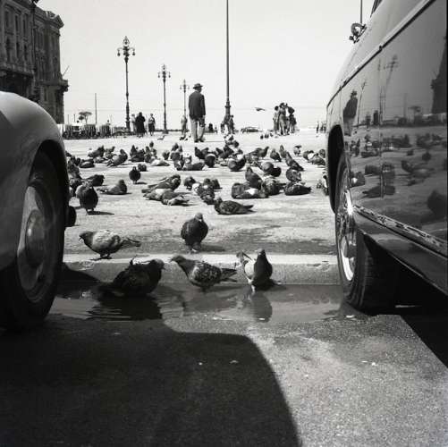 Piccioni in piazza Unità e banconiera della Torrefazione Extra