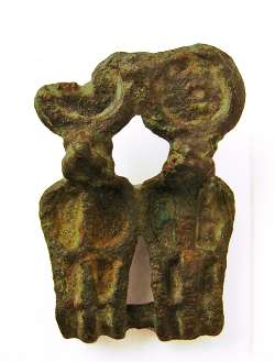 Elemento decorativo in bronzo raffigurante un ureo doppio con disco solare, dall'Egitto