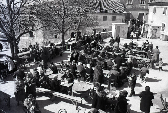 Viale XX Settembre: gente ai tavoli e albero dei bechi o de Rossetti