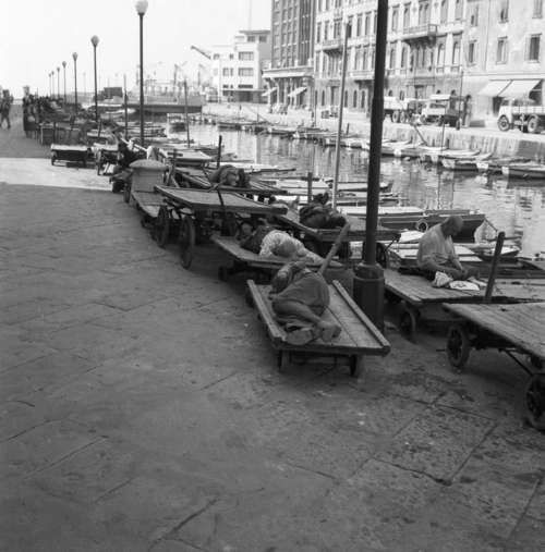 Foto estive : colombi spruzzati da acqua, gente dorme su panche, turista in costume