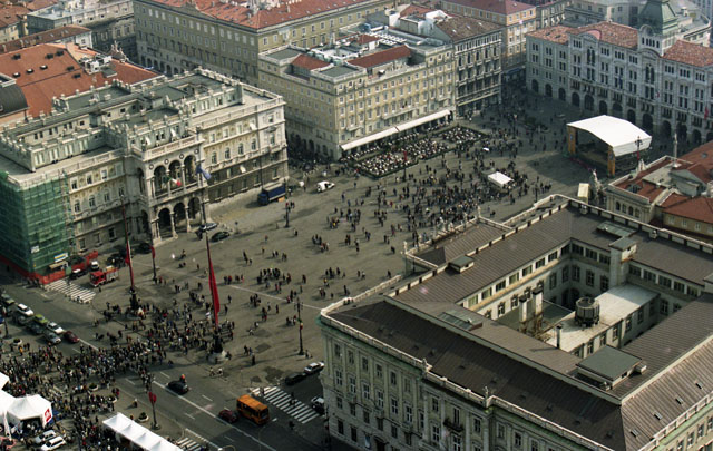 Foto aeree di Trieste: Piazza Unità, municipio, rive, Ponterosso. Basket: Scoccimaro, Pancotto, Ansaloni. Degrado: Borgo S. Sergio