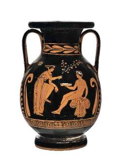 Pelike attica a figure rosse con Eros che allaccia il sandalo a una fanciulla