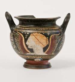 Skyphos pisside apulo a figure rosse, Lato A: satiro davanti a cippo con uovo; Lato B: testa femminile.