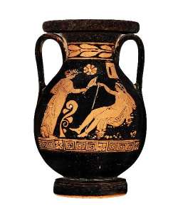 Pelike attica a figure rosse. Lato A: due donne e una cassa. Lato B: donna