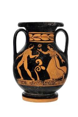 Pelike apula a figure rosse. Lato A: giovane nudo e donna; Lato B: due giovani ammantati
