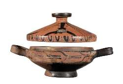 Lekanis con coperchio a vernice nera sovraddipinta
