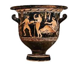 Cratere a campana apulo a figure rosse. Lato A: gioco del kottabos; Lato B: tre giovani ammantati