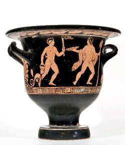 Cratere a campana apulo a figure rosse. Lato A: Dioniso e satiro; Lato B: due giovani ammantati