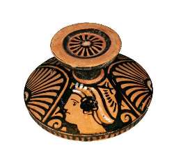 Coperchio di Lekanis apula a figure rosse con teste femminili.