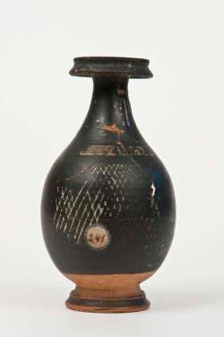 Bombylios o unguentario a bottiglia a vernice nera sovraddipinta a reticolo