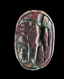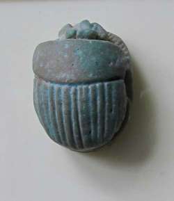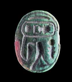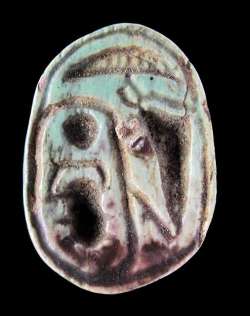 Scarabeo in faience con segni geroglifici non comprensibili, dall'Egitto