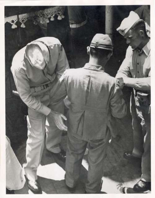 U. S. Marines search Japanese officer boarding Missouri