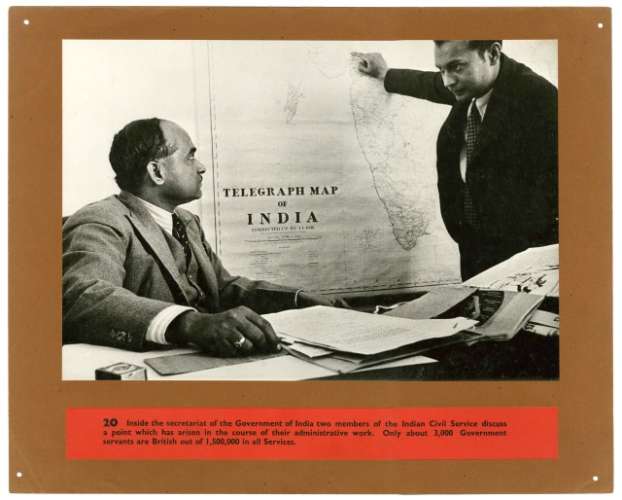 Inside the secretariat of the Government of India two members of the Indian Civil Service discuss a point which has arisen in the course of their administrative work. Only about 3.000 Government servants are British out of 1.500.000 in all Services