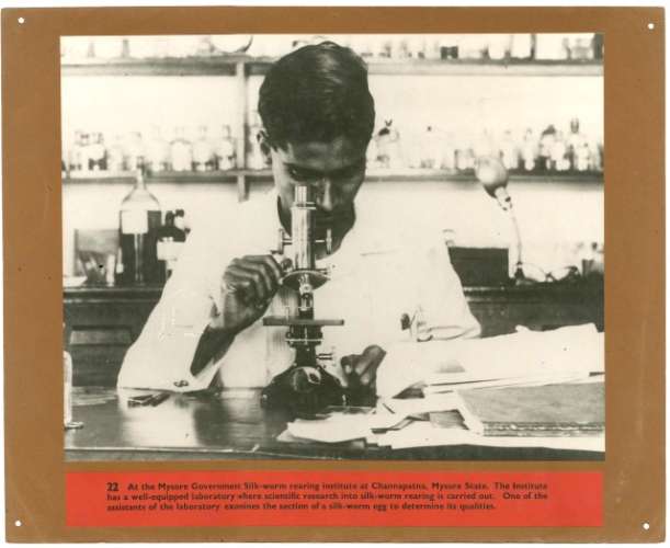 At the Mysore Government Silk worm rearing institute at Channapatna, Mysore State. The Institute has a well equipped laboratory where scientific research into silk worm rearing is carried out. One of the assistants of the laboratory examines the section of a silk worm egg to determine its qualities