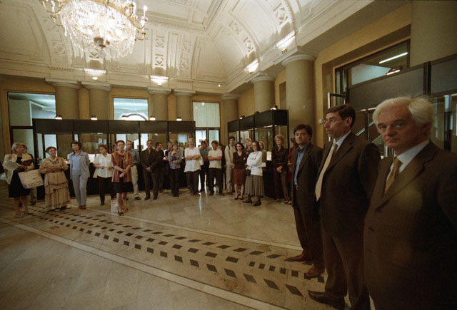 Premiazioni Lloyd Adriatico, premio biennale, 1999, Cucchiani, Claudio Magris. Saccari, Illy, Ravignani, Borruso. Museo Revoltella. Marchesich, piazza Unità.