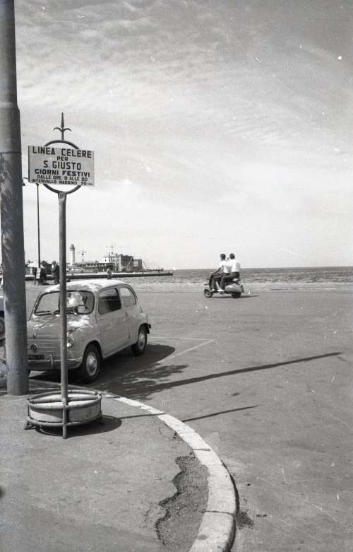 Bagnanti in scogliera; vedute di S. Giusto e fotografo; cassettista; turisti (anche sulle rive)