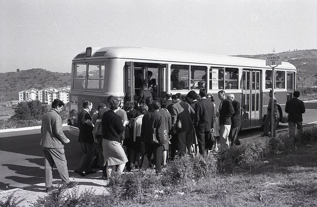 Numerose persone salgono sull'autobus 21