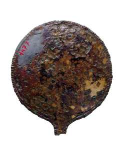 Specchio con bordo segnato da fila di forellini in bronzo
