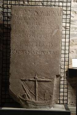 Epitafio in memoria di Publio Clodio Quirinale con figura di nave in calcare da Trieste piazza Oberdan