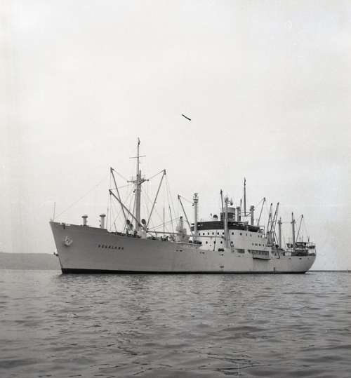 Arrivo e scarico caffè nave Vegaland ; Nave da guerra F564
