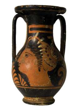 Pelike apula a figure rosse. Lato A: civetta tra elementi vegetali. Lato B: palmetta