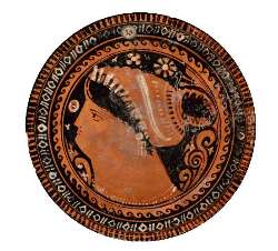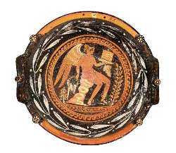 Phiale apula a figure rosse. Lato A e B: Dioniso e menade