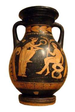 Pelike apula a figure rosse. Lato A: giovane e fanciulla>; Lato B: due giovani ammantati