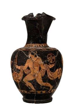 Oinochoe attica a figure nere con Eracle che combatte contro una amazzone