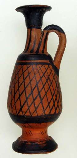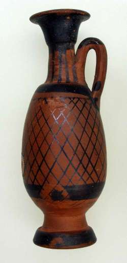 Bombylios o unguentario a bottiglia a vernice nera sovraddipinta a reticolo