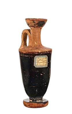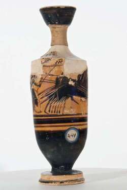 Lekythos attica a figure rosse con palmetta ad antefissa.