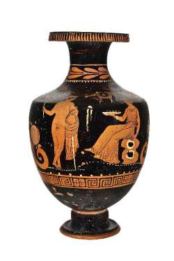 Hydria apula a figure rosse con giovane seduto e donna presso un pilastro